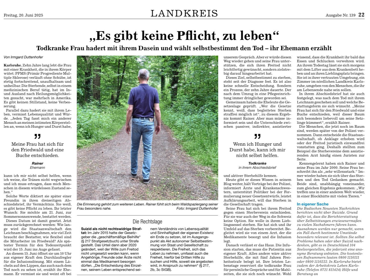 Der zweite Artikel erschien am 20. Juni unter dem Titel „Es gibt keine Pflicht, zu leben“ (Autorin: Irmgard Duttenhofer). Er beleuchtet die Geschichte einer weiteren MS-Patientin (PPMS) aus dem Landkreis Karlsruhe – erzählt aus der Perspektive ihres Ehemannes. Über viele Jahre hinweg begleitete er seine Frau auf dem Weg zu ihrer Entscheidung, das Leben in Würde und in selbstgewähltem Moment zu beenden. Der Text vermittelt eindrucksvoll, wie bewusst und sorgfältig dieser Weg beschritten wurde – unter Einhaltung der gesetzlichen Rahmenbedingungen und im geschützten Rahmen des vertrauten, privaten Umfelds.